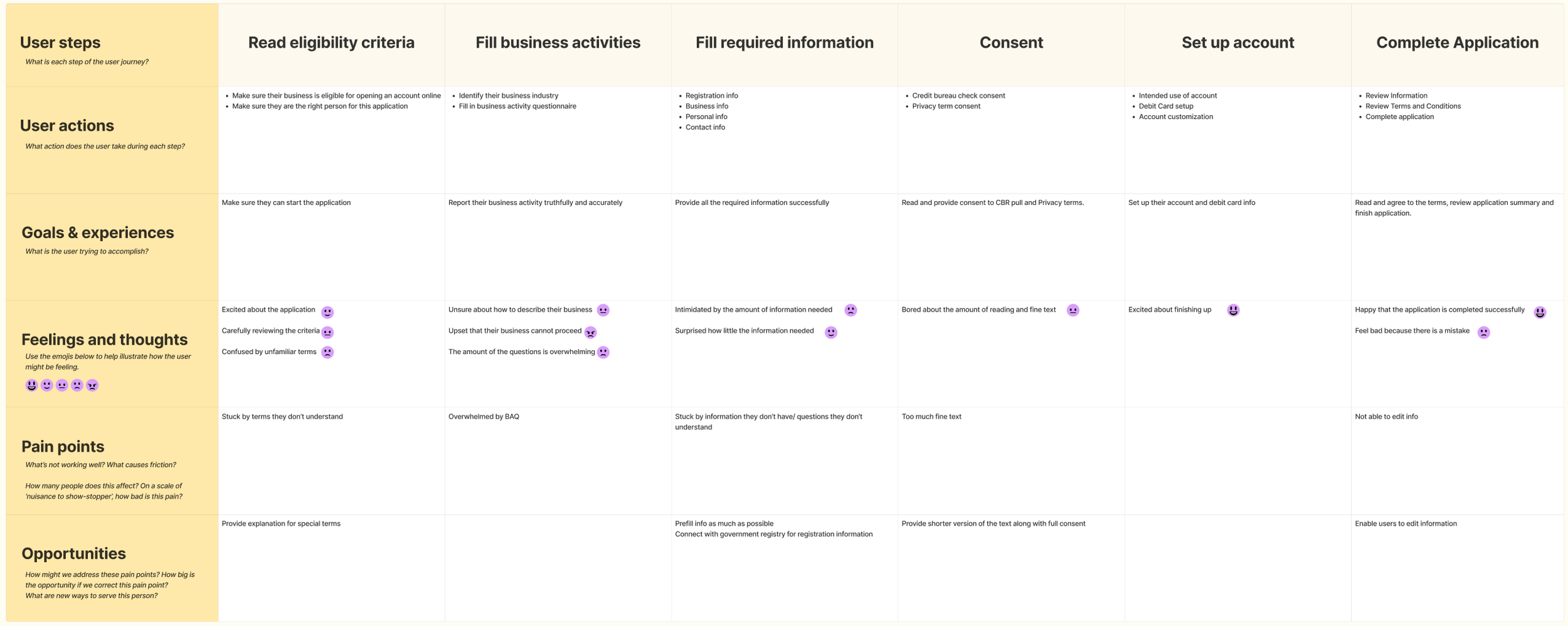 Expert consultations with SMEs from privacy, legal, and anti-money laundering (AML) sectors further emphasized the critical importance of data accuracy, client data privacy, and anti-money laundering measures in business banking account opening. Integrating their insights, we fortified our design approach to prioritize security and compliance, ensuring a trusted and seamless experience for our users.